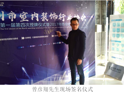 當(dāng)前位置:首頁(yè) > 新聞中心 > 企業(yè)動(dòng)態(tài) 2017年12月26日,深圳市室內(nèi)裝飾行業(yè)協(xié)會(huì)第四次授牌儀式暨2017年終總結(jié)大會(huì)于深圳紅星美凱龍香蜜湖商場(chǎng)隆重舉辦。此次授牌儀式有來(lái)自優(yōu)秀企事業(yè)單位及設(shè)計(jì)師人才400多位精英共同見證這個(gè)激動(dòng)人心的時(shí)刻。深圳市彥翔設(shè)計(jì)顧問(wèn)有限公司執(zhí)行總監(jiān)曾彥翔先生受邀本次授牌儀式活動(dòng),同時(shí)當(dāng)選深圳市室內(nèi)裝飾行業(yè)協(xié)會(huì)第一屆理事一職。